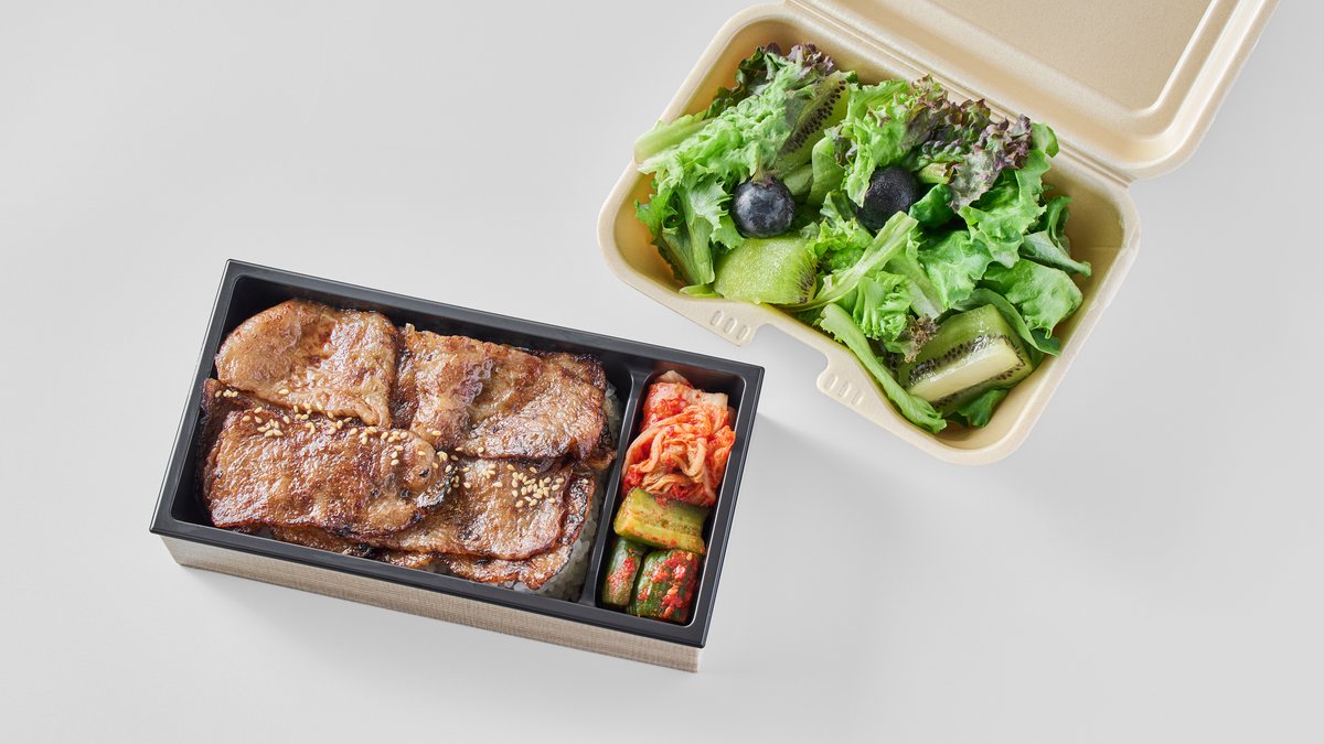 ご飯が進む焼肉弁当と新鮮なグリーンサラダがセットになった、ボリューム満点のメニューです。