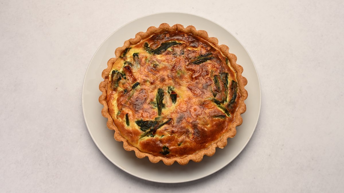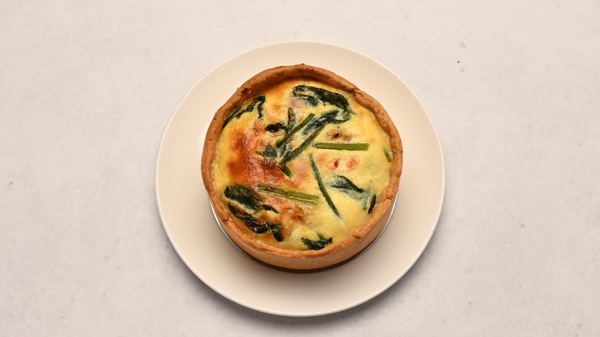 約12cmの自家製キッシュホール 自家製ベーコン、玉ねぎ、旬の野菜を入れたキッシュ。 生地には発酵バター、チーズはセルロースの入っていないよつ葉のシュレットチーズを使用。