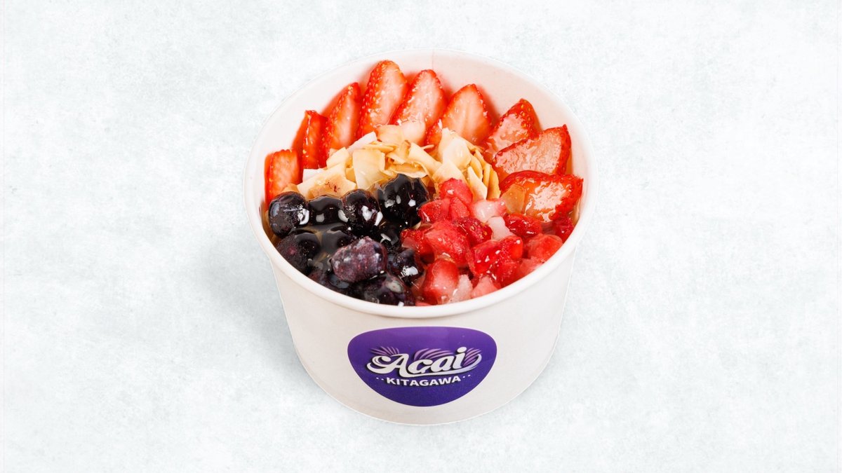 グラノーラ、ココナッツチップ、生いちご、ストロベリー、ブルーベリー、ハチミツをトッピングしています。ベリーの果実味溢れるアサイーボウルです。 An acai bowl bursting with fruity flavor, generously topped with an assortment of strawberries and blueberries.