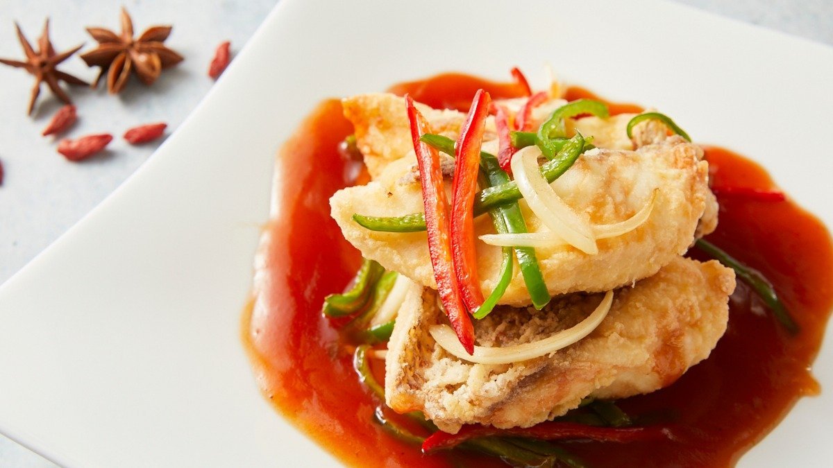 特製の甘酢あんとサクサクに揚げた白身魚をお楽しみください。
