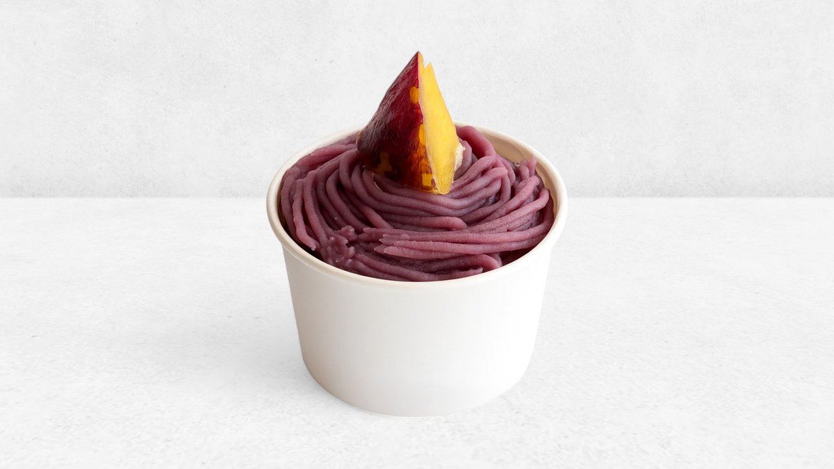 紫芋の優しい甘さと鮮やかな色が特徴のモンブラン風ソフトクリームです。見た目も美しく、女性にも人気です。