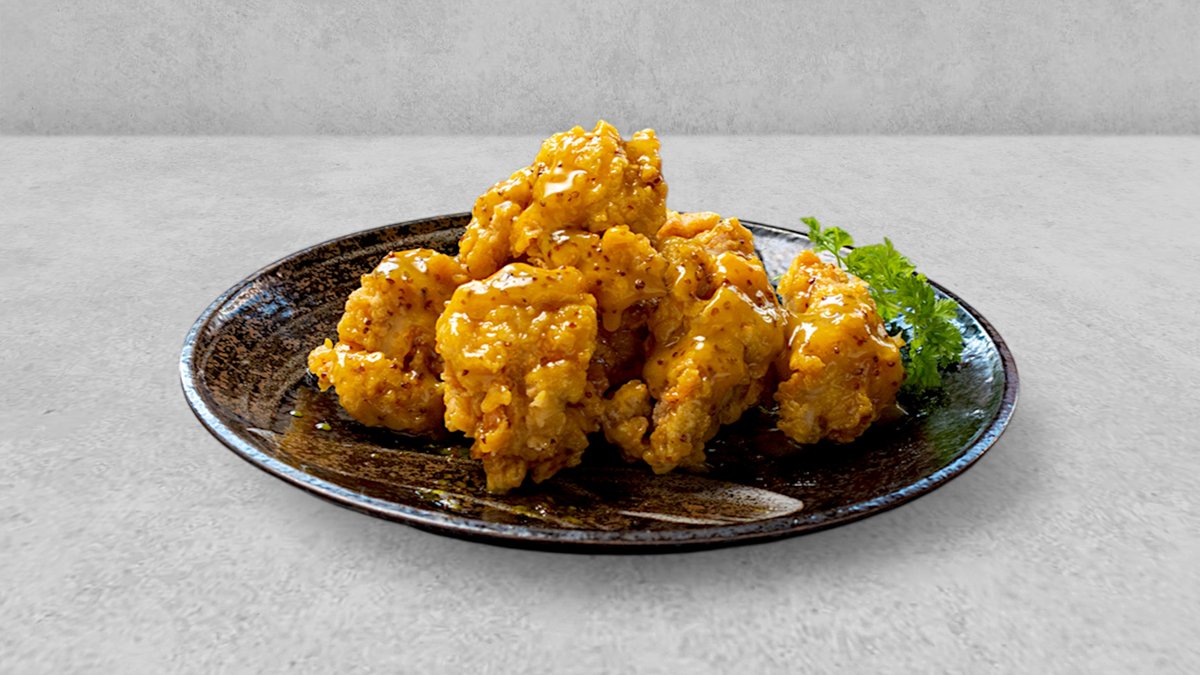 カリッと揚げたチキンをマスタードとハチミツの海に溺れさせた、ピリッと甘いチキンです。