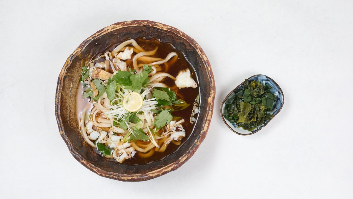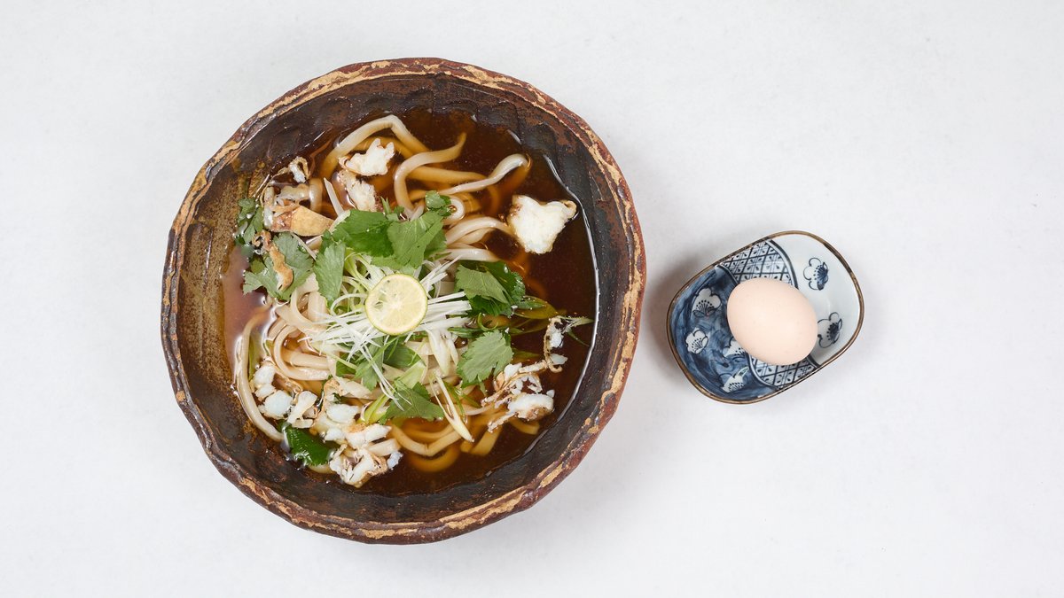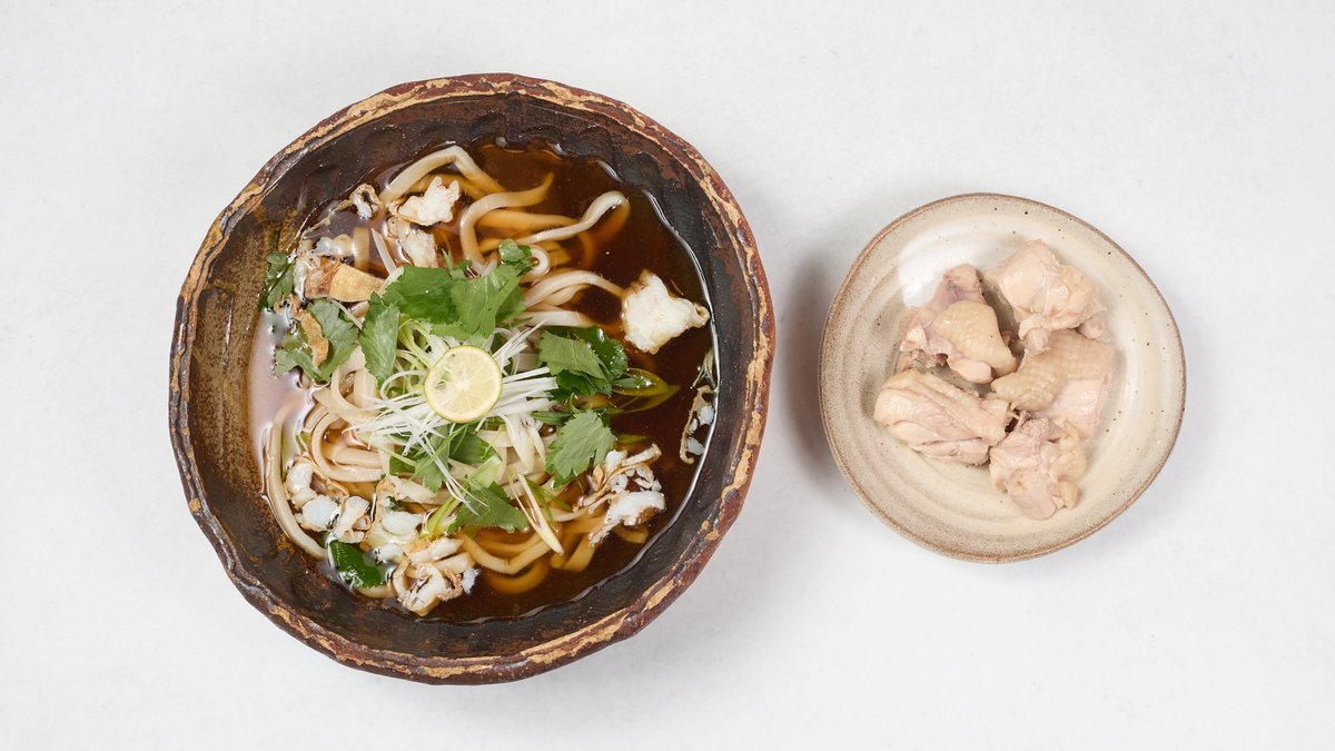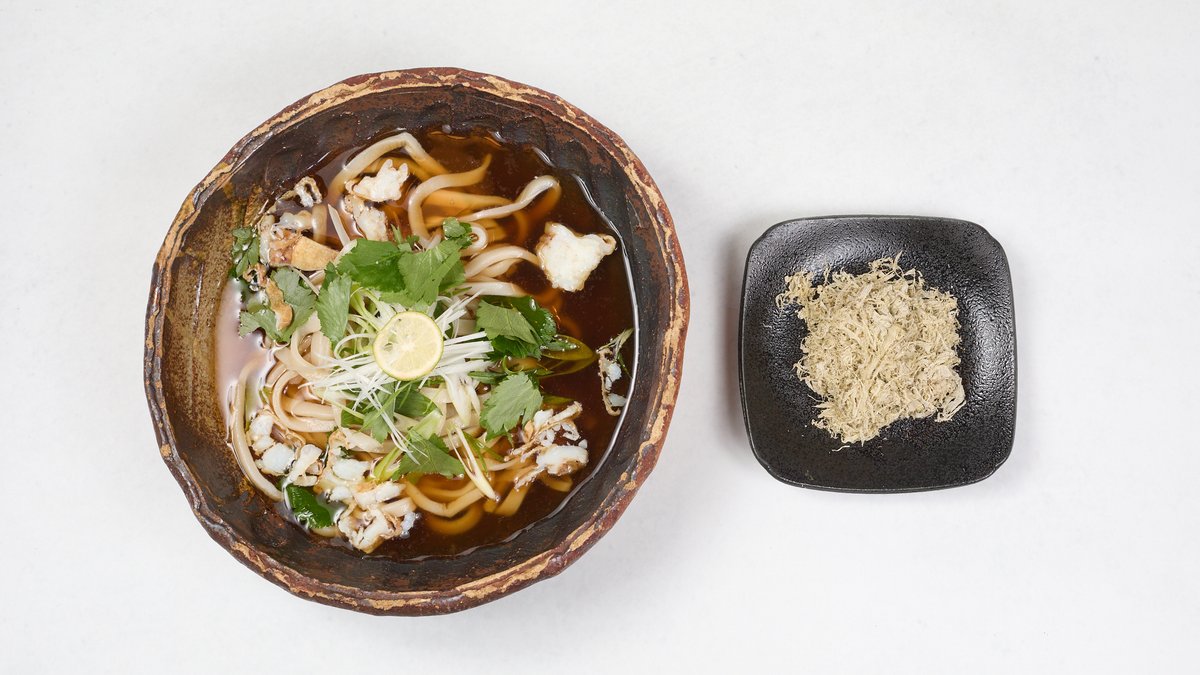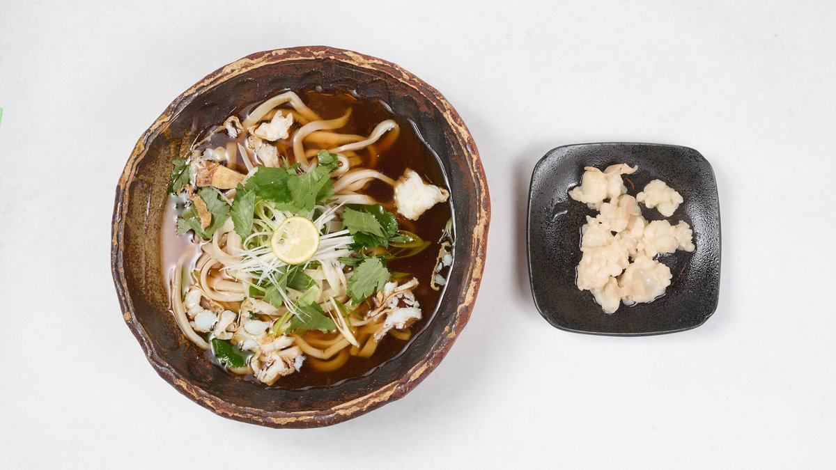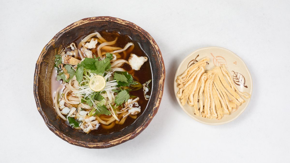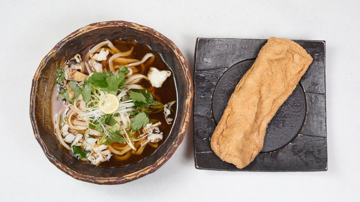 「屋台 稀。」では、自然の恵みに真摯に向き合い、安心・安全で心に沁みる一杯をご提供しています。使用するうどん粉は、無漂白の国産・出雲産小麦。でんぷんは北海道産じゃがいも、塩は岩塩、昆布は北海道道南産の天然もの、出汁には鯖・マグロ・イワシ・カツオの本節を贅沢に使用。醤油は30年以上熟成された奥深い味わい逸品を使用しています🥢
