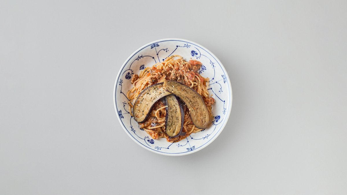 茄子とひき肉のトマトソースのパスタです。