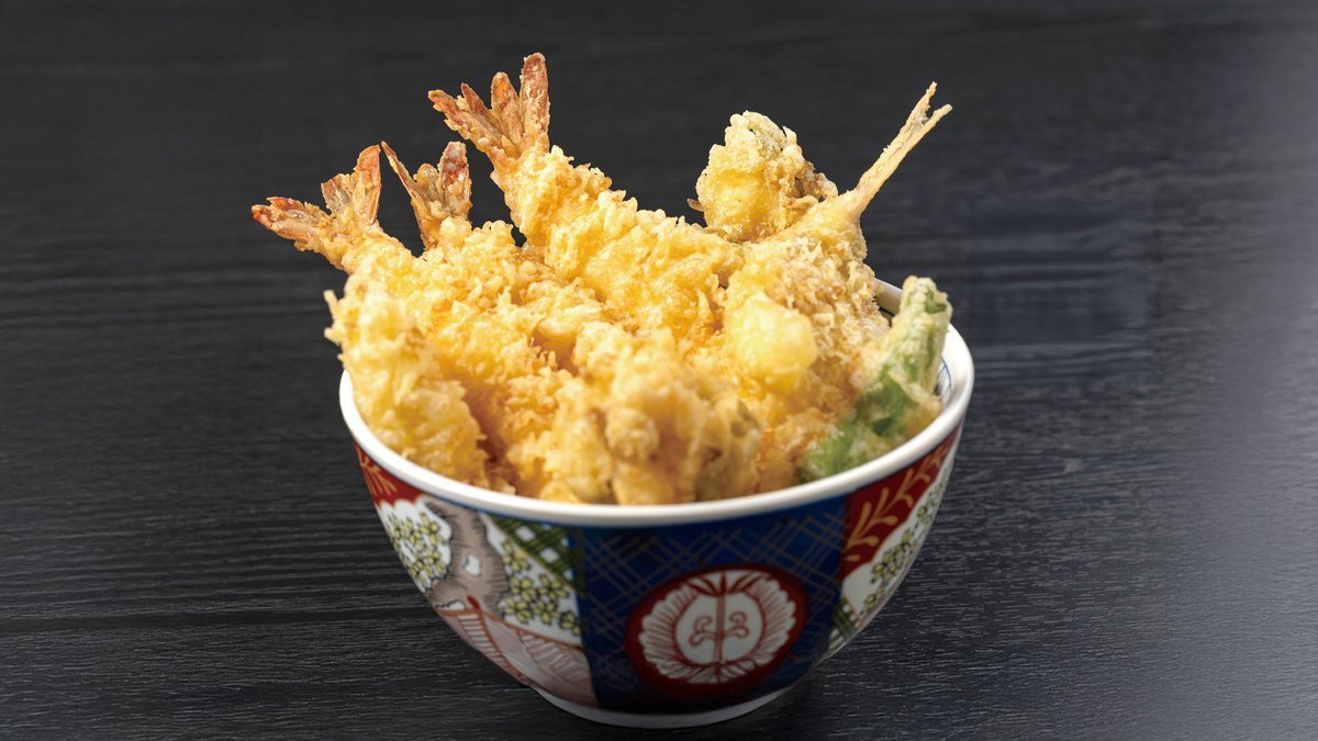 9個の天ぷらが乗ったボリューム満点人気の天晴天丼です!(海老×3、かぼちゃ×3、白身魚、ホタテ、イカ、オクラ)