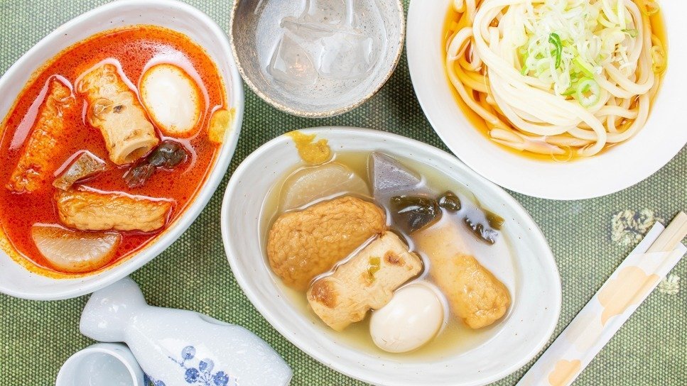 おでん処では、熱々のだしに浸かった絶品おでんを堪能できます🍢!おいしいお出汁を使ったうどんもご用意しています!