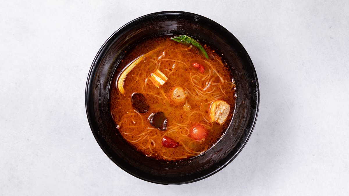辛さと香りが特徴のスパイシーなスープです。 (スープ+タンフン+ラム肉+ニラ+ミニトマト+チンゲン菜+エノキ+キクラゲ+湯葉+厚揚げ+鷹の爪)