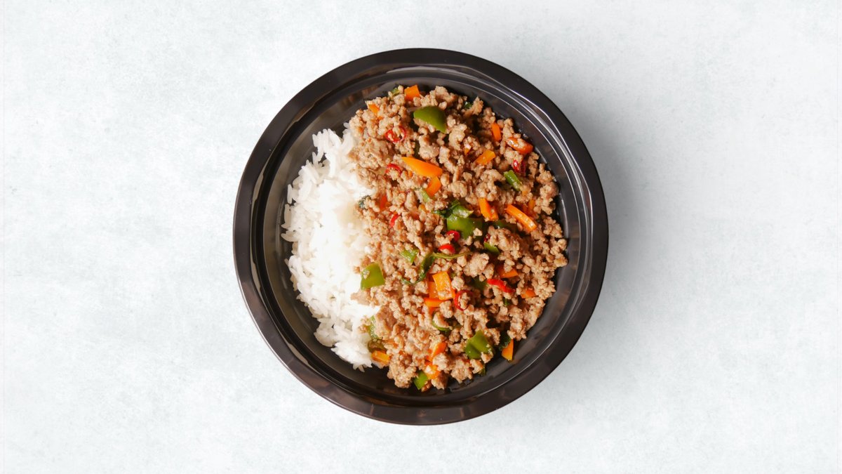 バジルの香りが食欲をそそる、鶏ひき肉のバジル炒めご飯です。 Stir-fried minced chicken with basil on rice, with an appetizing basil scent.