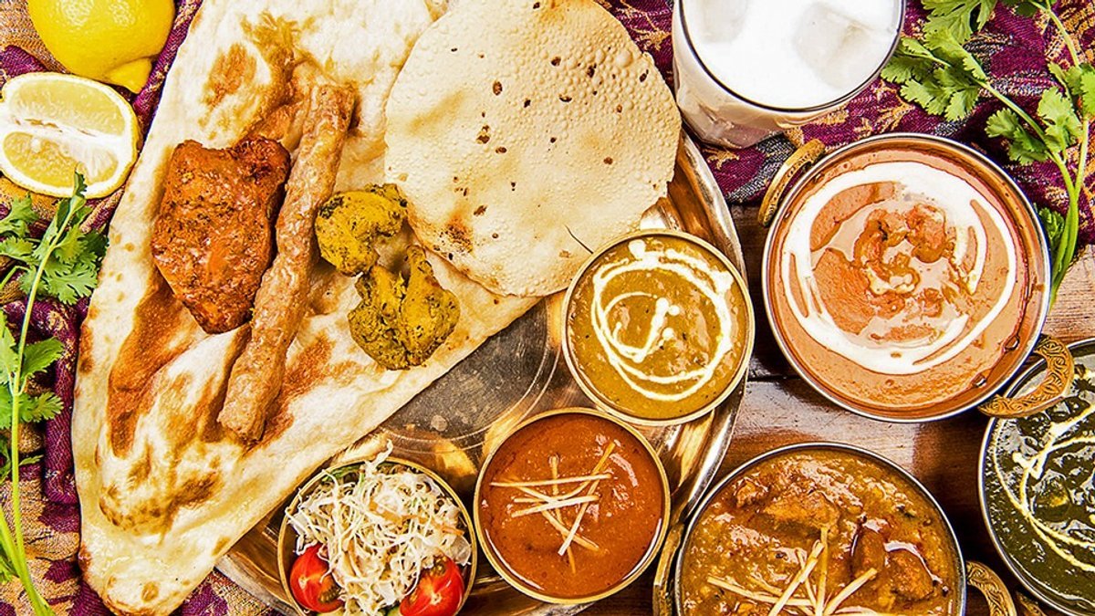 タンドリーチキン(1本)、グリーンサラダ、シークケバブ(1本)、バターチキンカレー、ラムカレー、ナンまたはライスのセットです。