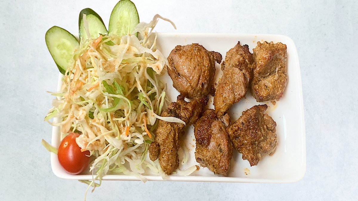 オリジナルスパイスに漬け込んだ豚の角切りにフレッシュレモンを添えて、タンドールでじっくり焼き上げました。Pork cube pieces marinated with original spices touch of fresh lemon. grilled slowly in tandoor served and with salad.
