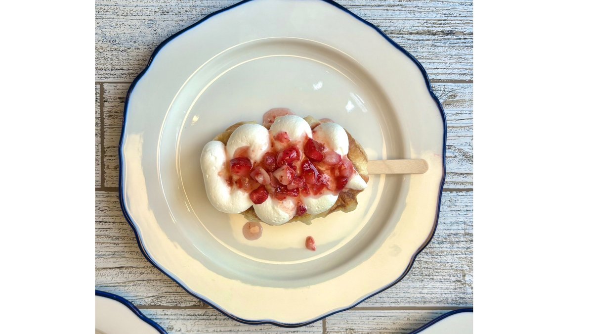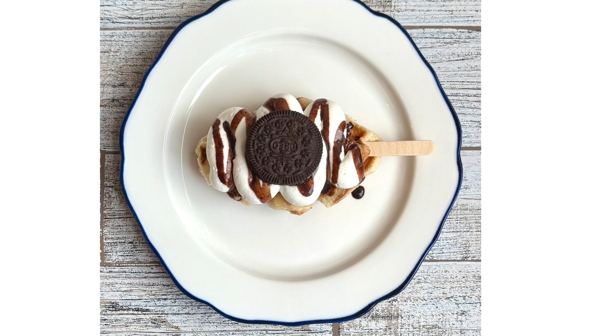 甘酸っぱいいちごとたっぷりの生クリームが主役の、見た目も華やかなスイーツクロッフル。いちごの赤とクリームの白が映えて、写真映えにもぴったり!