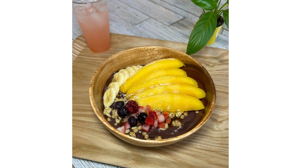 アサイースムージーにマンゴーをたっぷりトッピング!マンゴーの甘味と、バナナ、ベリーのフレッシュさが相性抜群!満足感のある気分も映えるおいしさ!
