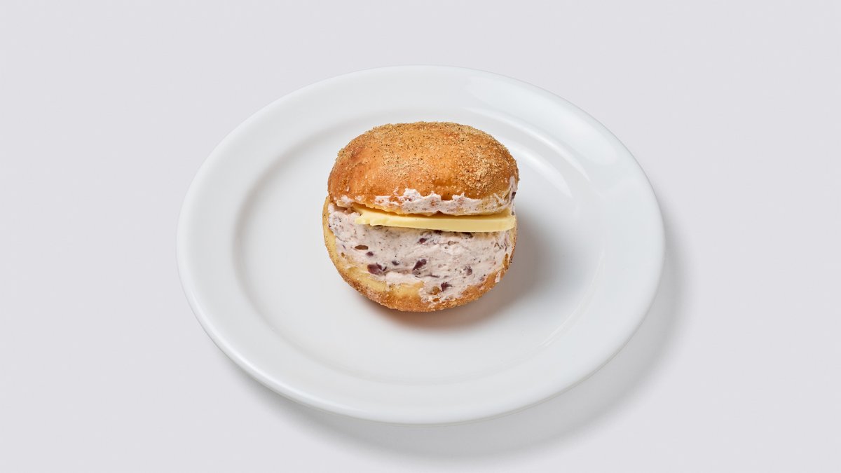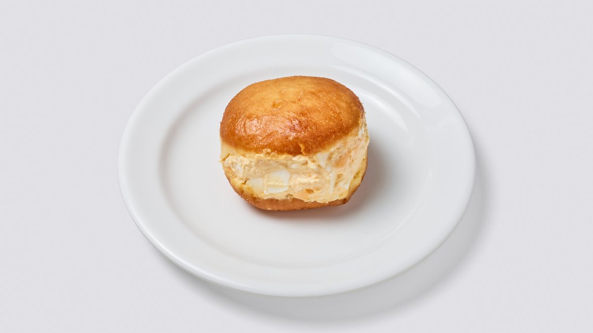 ふわふわのドーナツ生地に、クリーミーでまろやかな玉子サラダをサンドした惣菜系のドーナツです。軽食にもぴったりの一品です。 / Savory donut featuring fluffy donut dough filled with creamy and mild egg salad. It is perfect for a light meal or snack.