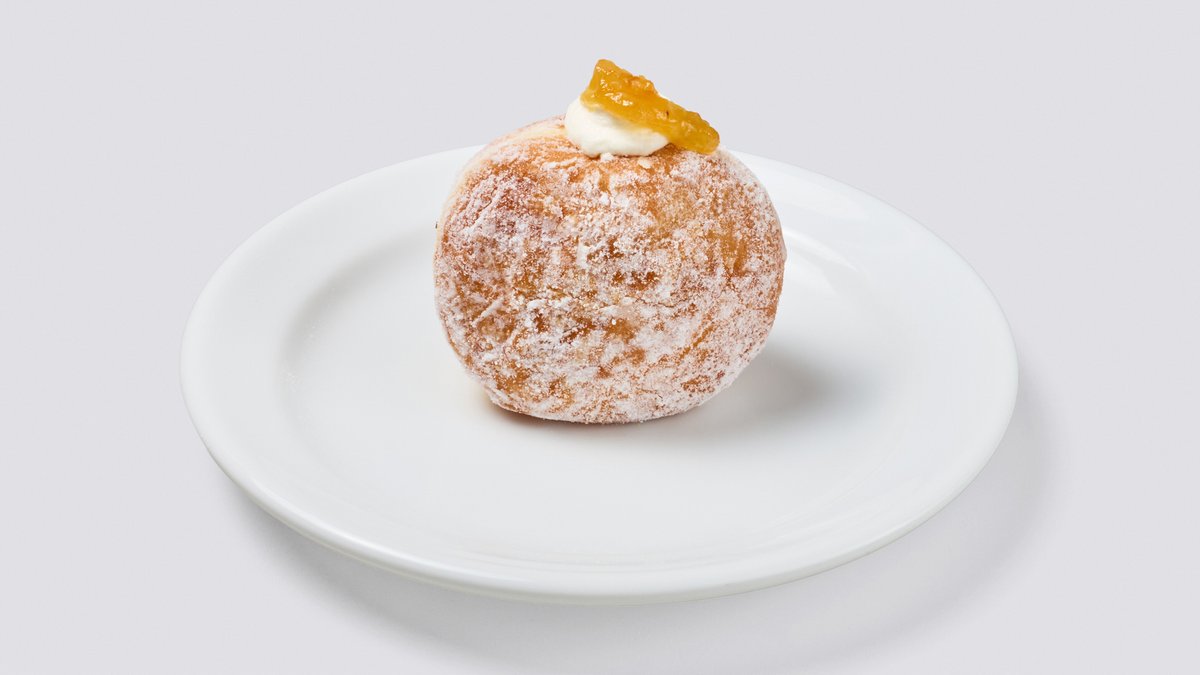 爽やかなクリームチーズホイップに、甘酸っぱいオレンジマーマレードの果肉を添えた上品な一品。 / An elegant donut combining refreshing cream cheese whipped cream with tangy orange marmalade pieces.
