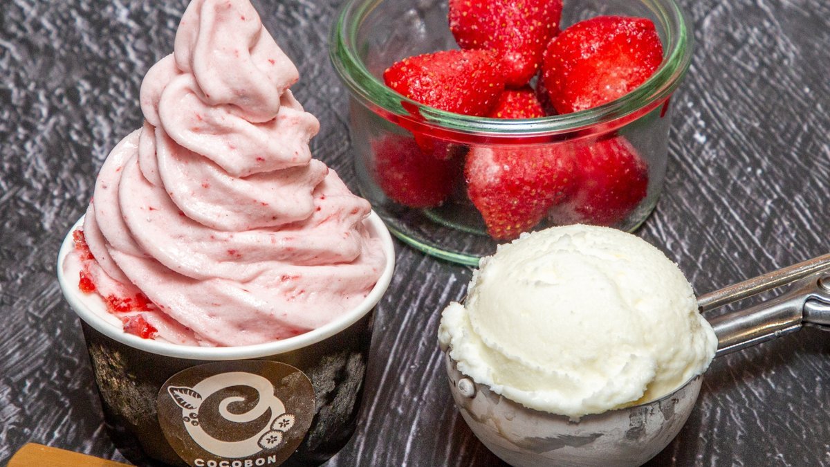 ココボンの人気ナンバーワンソフトです!ご注文いただいてからフローズンストロベリーとミルクアイスをミックスして作ります。出来立てソフトクリームをどうぞ。