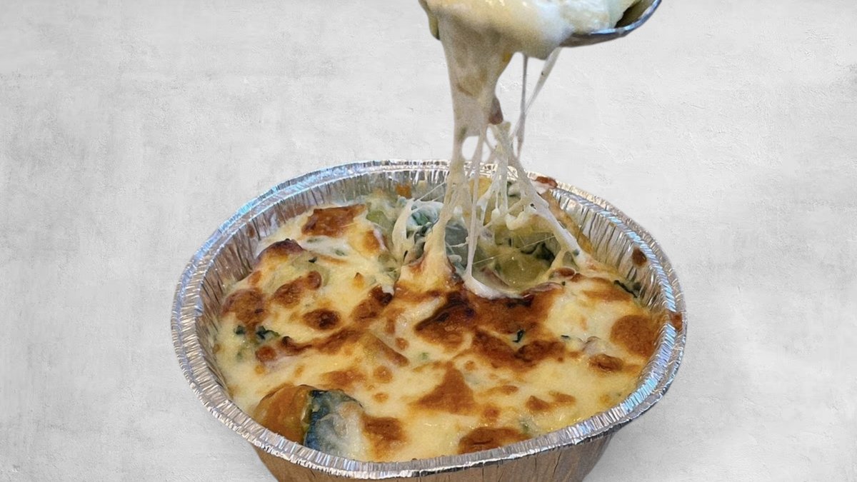 具材がたっぷり乗った、おひとり様サイズの米粉ピザ、自家製の米粉のホワイトソースで作るアツアツのグラタンです。 (プラスチックゴミ削減のため、おしぼり・フォークご希望お客様はコメントにてお申し出ください)