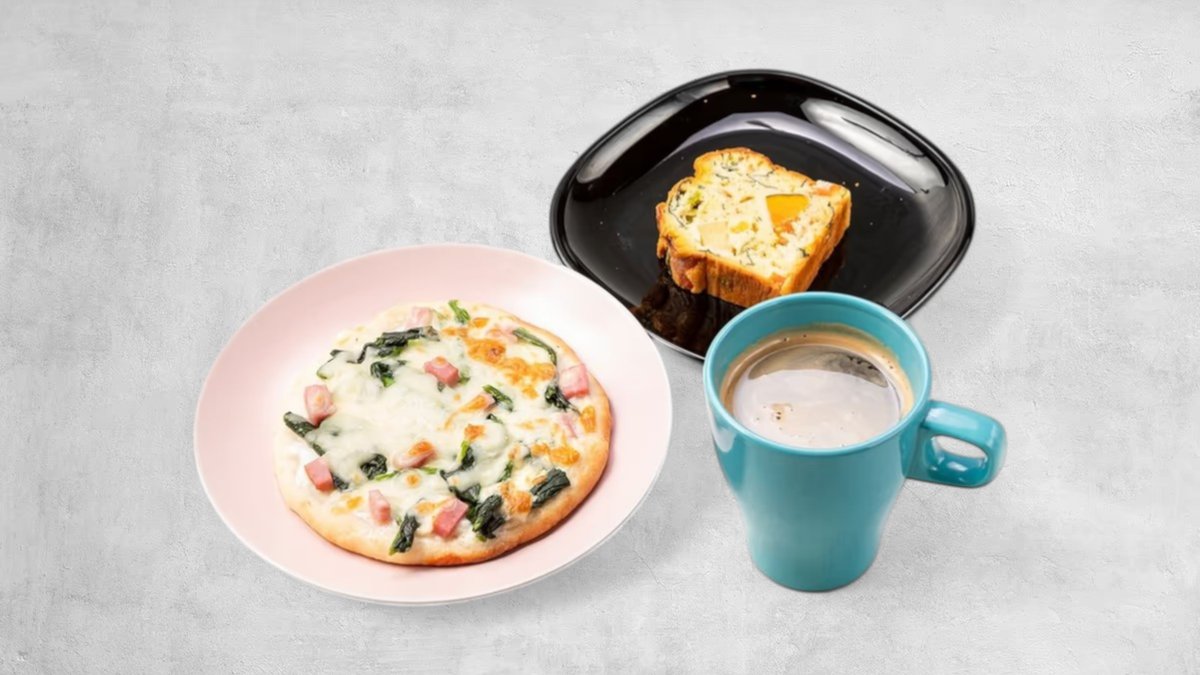 「ベーコンとほうれん草のピザ」とケークサレ(1pc)とドリンクが付いたお得なセットです。【アレルギー:乳、卵】