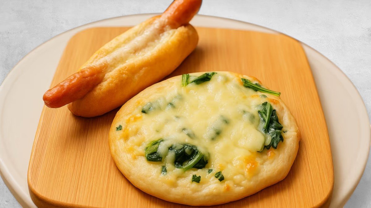 「ベーコン&ほうれん草のピザ」と「チーズドッグ(ハニーマスタードソース)」のセットです🍕🌭 トッピングをお選びいただいた場合はピザのみ対象となります。