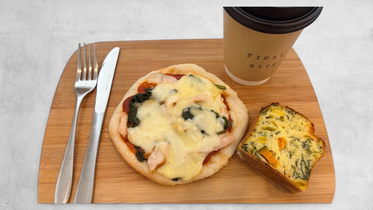 「チキン&ほうれん草のピザ」とケークサレ(1pc)とドリンクが付いたお得なセットです。【アレルギー:乳、卵、大豆】
