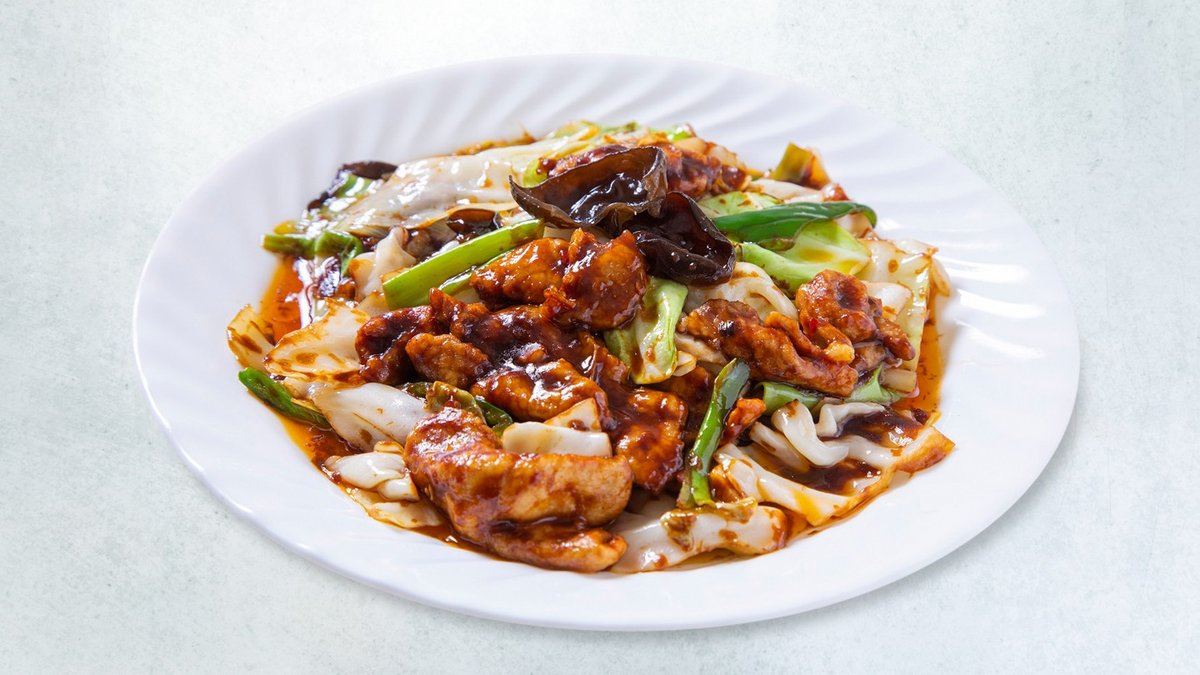 野菜、肉、イカ、鶏、豚、木耳等5種類以上の食材を使用した醤油味のあんかけ焼きそばです。