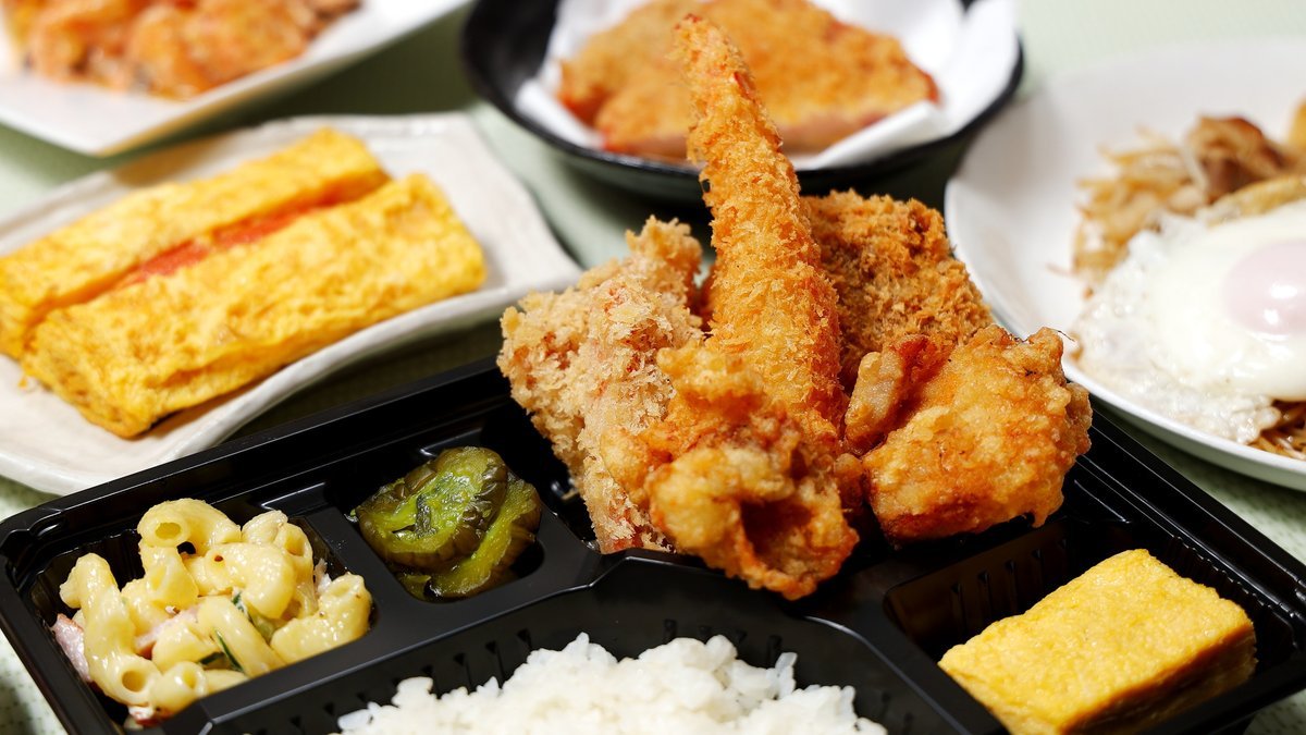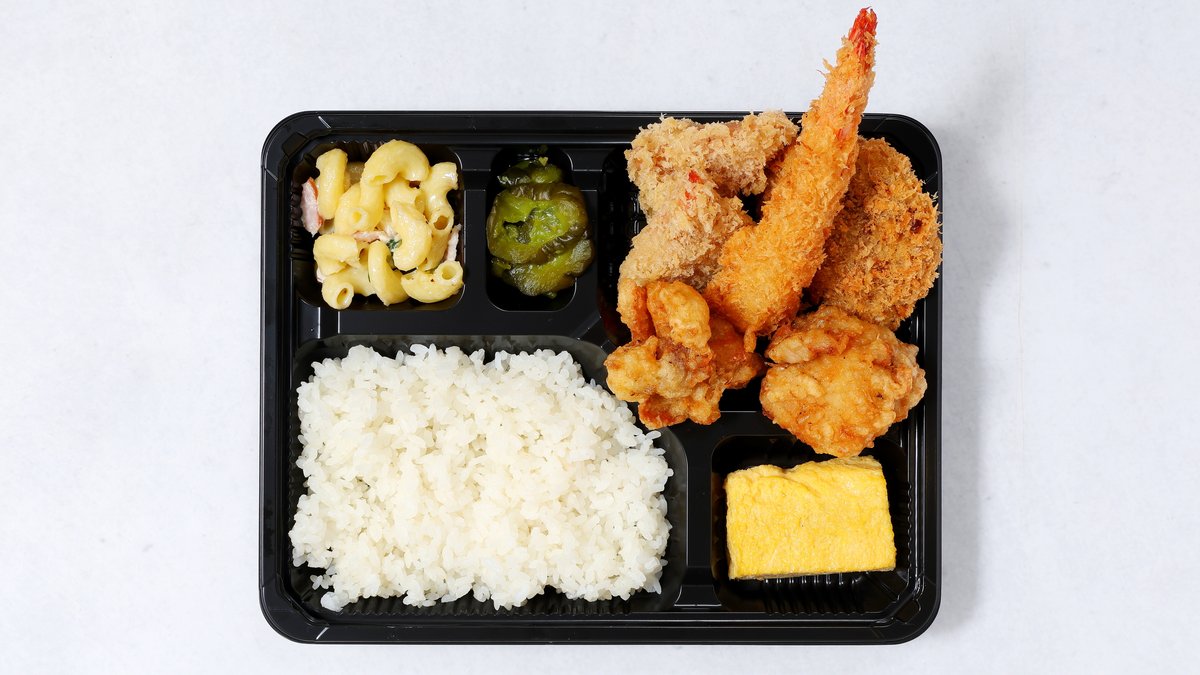 おいしくてバラエティ豊かなお食事をお楽しみいただけます。ザンギ2個、エビフライ1個、メンチカツ1個、ハムカツ半分が入っております。