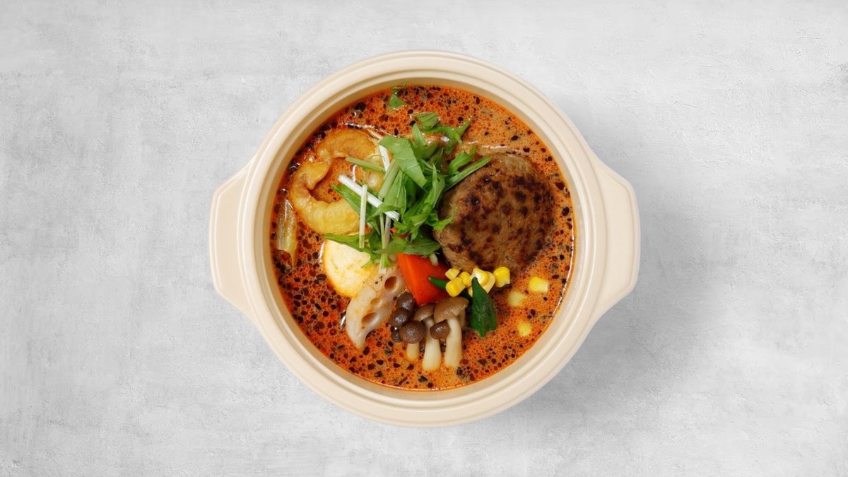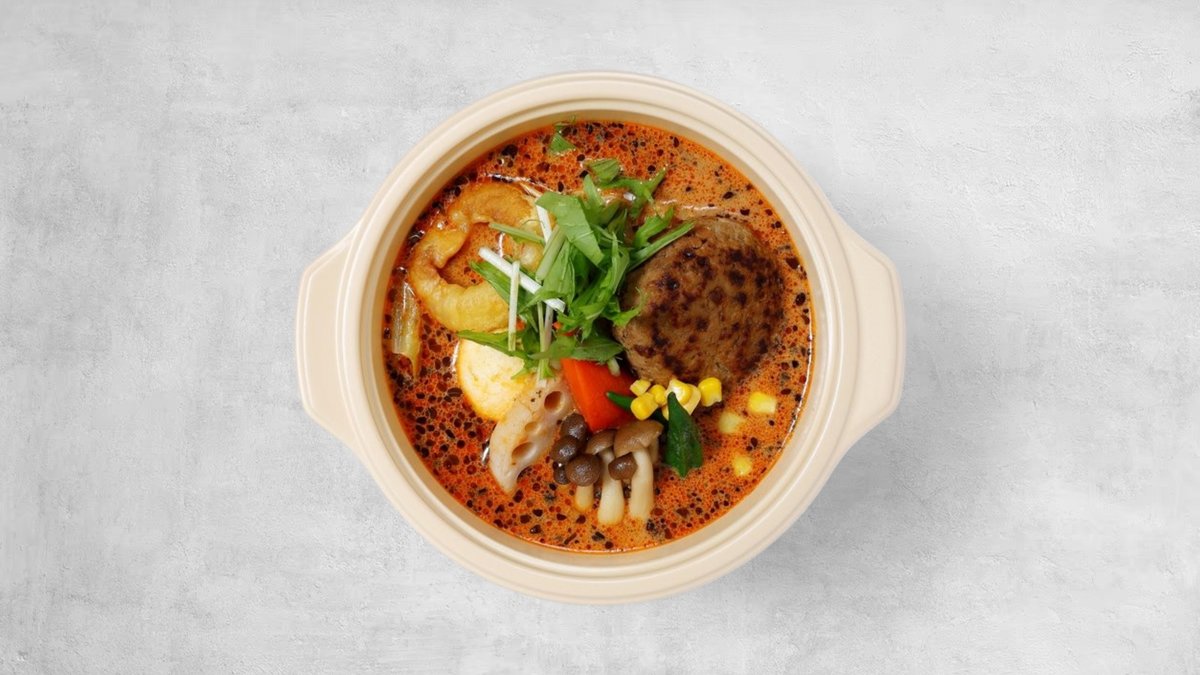 肉厚ハンバーグがのったボリューム満点の一杯。 ブラックペッパー香るスープが、ハンバーグのジューシーさをぐっと引き立てます。 ※写真はベジタブルカレーです。