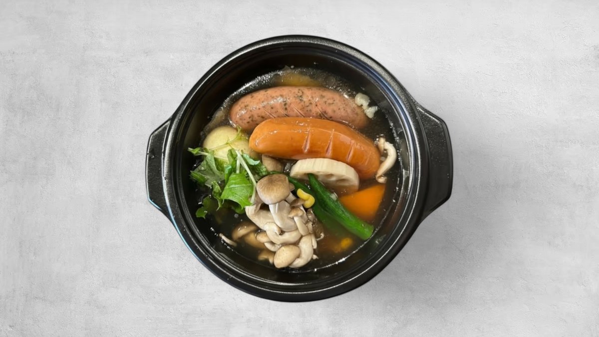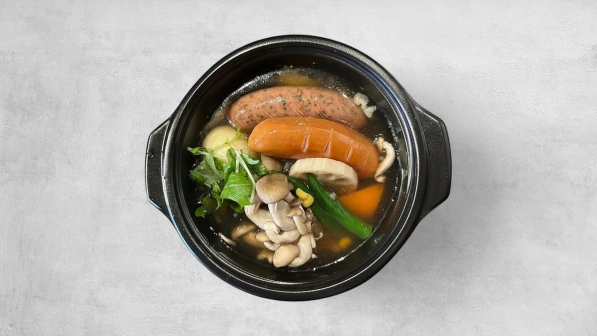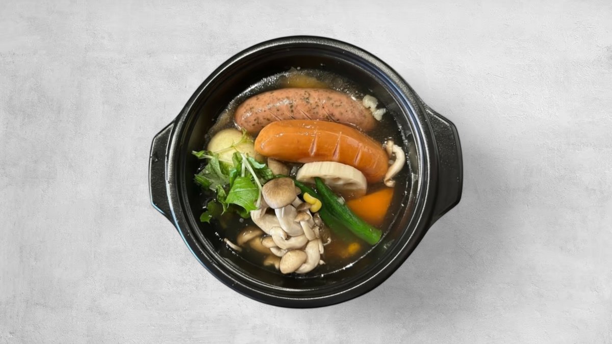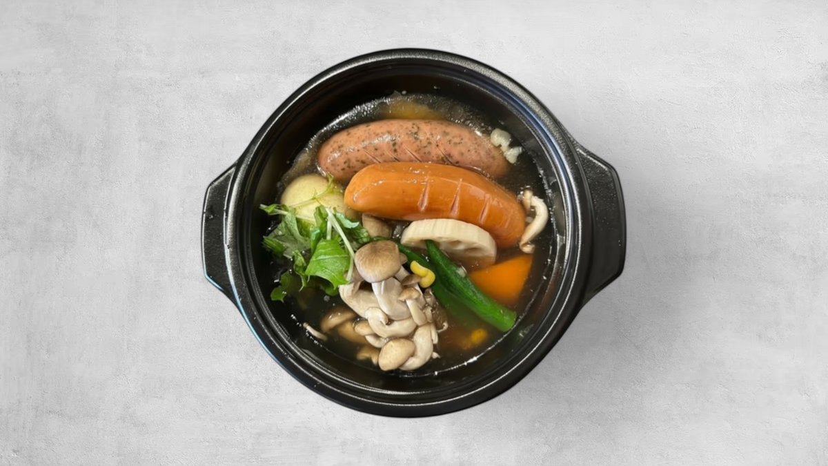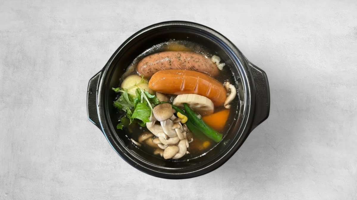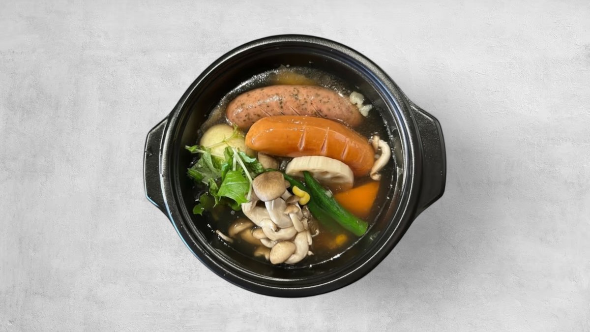 ソーセージを贅沢に2本使用したボリューム系メニュー。 ブラックペッパーの効いたスープと肉汁たっぷりのソーセージの相性は抜群です。