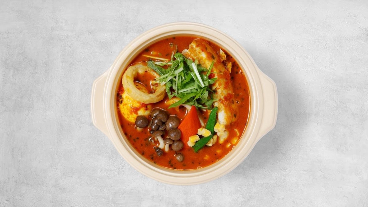 香ばしく焼き上げたチキンがたっぷり入った一杯。 焦がしバジルとトマトの旨みが凝縮した濃厚スープに、チキンのジューシーさがよく合います。クセになる味わいの定番人気。 ※写真はポークカレーです。