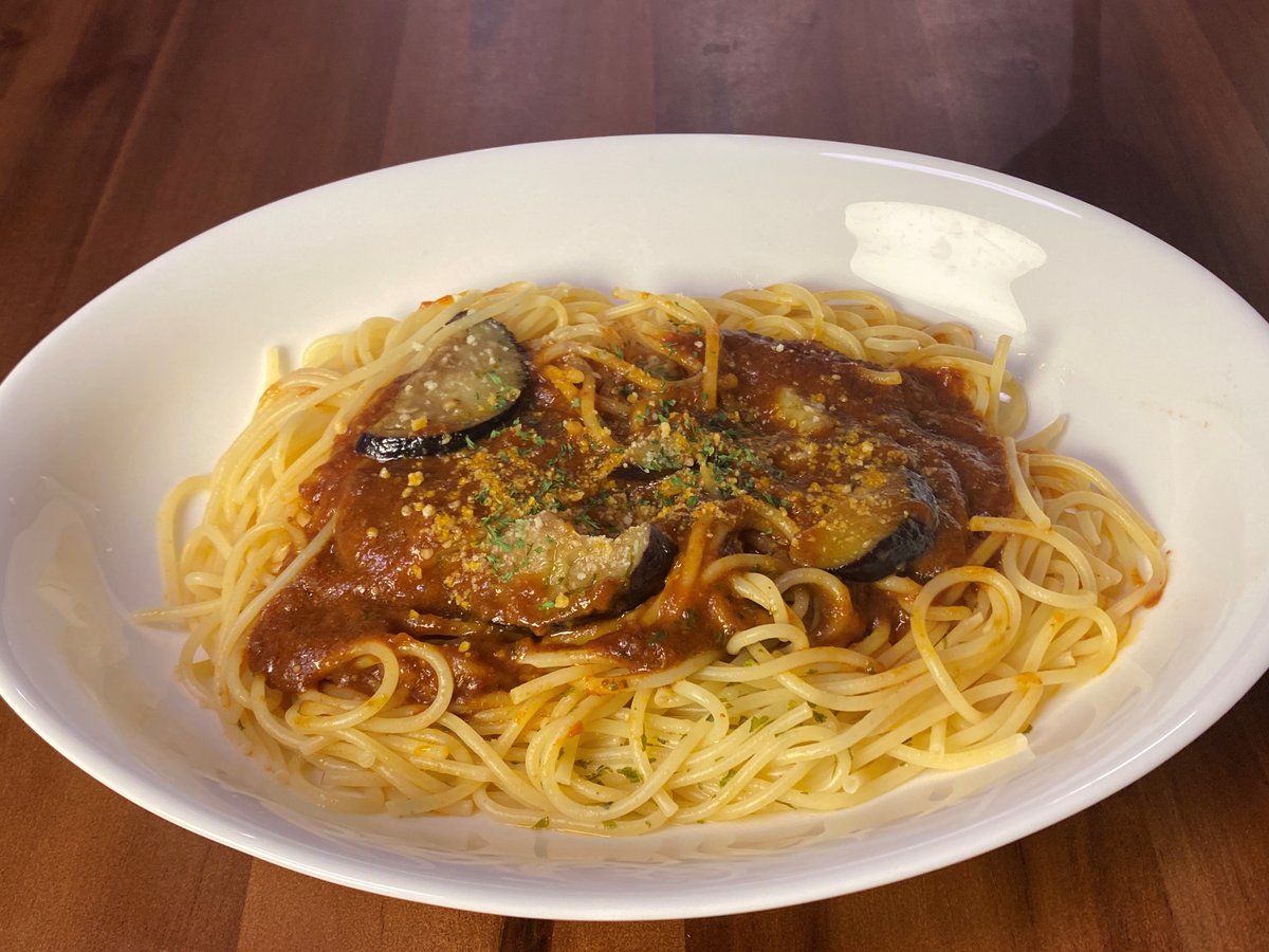 もっちり弾力があるパスタに牛ひき肉をじっくり煮込んだボロネーゼソース、 ジュワッと揚げた上げナスをトッピング。濃厚粉チーズもたっぷり。