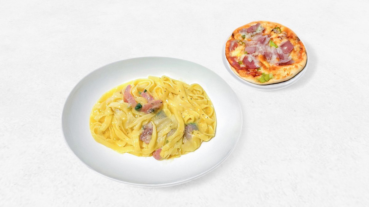 豪華なイタリアンセット!濃厚なカルボナーラパスタとサクサクのミニピザを一緒に楽しめます。二種類の味わいを