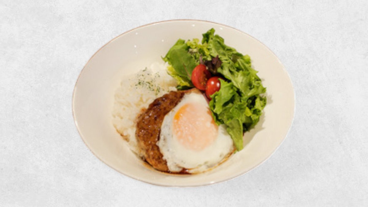 ジューシーなハンバーグと特製ソースを、ライスと一緒にお楽しみください。ボリューム満点の一品です。