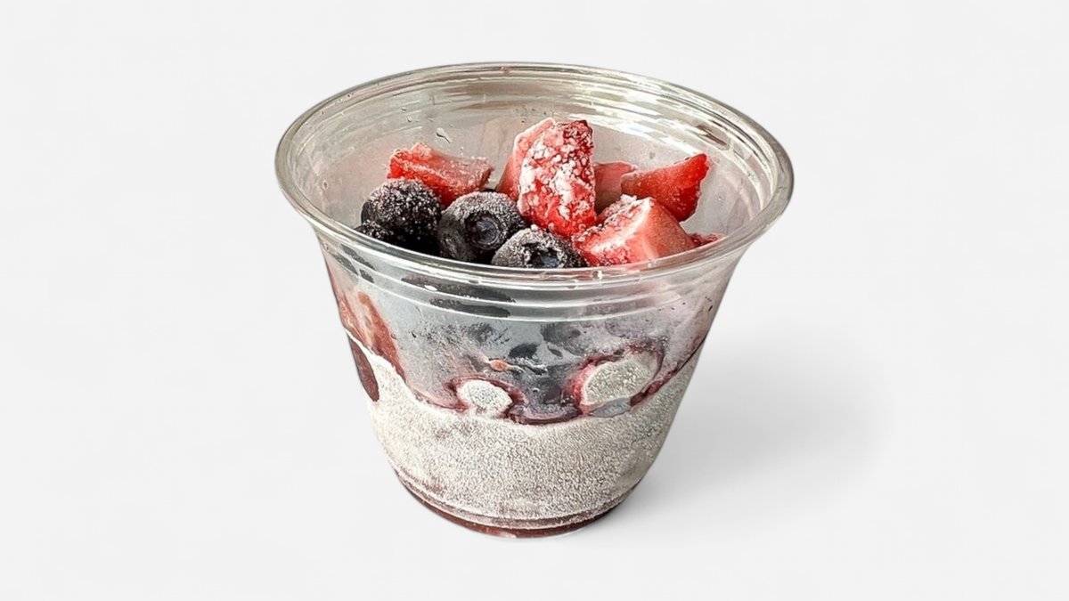 冷凍庫で保管して好きな時に食べても良いミニカップです。120mlのアサイーとフルーツ・ココナッツ・ハチミツ入り