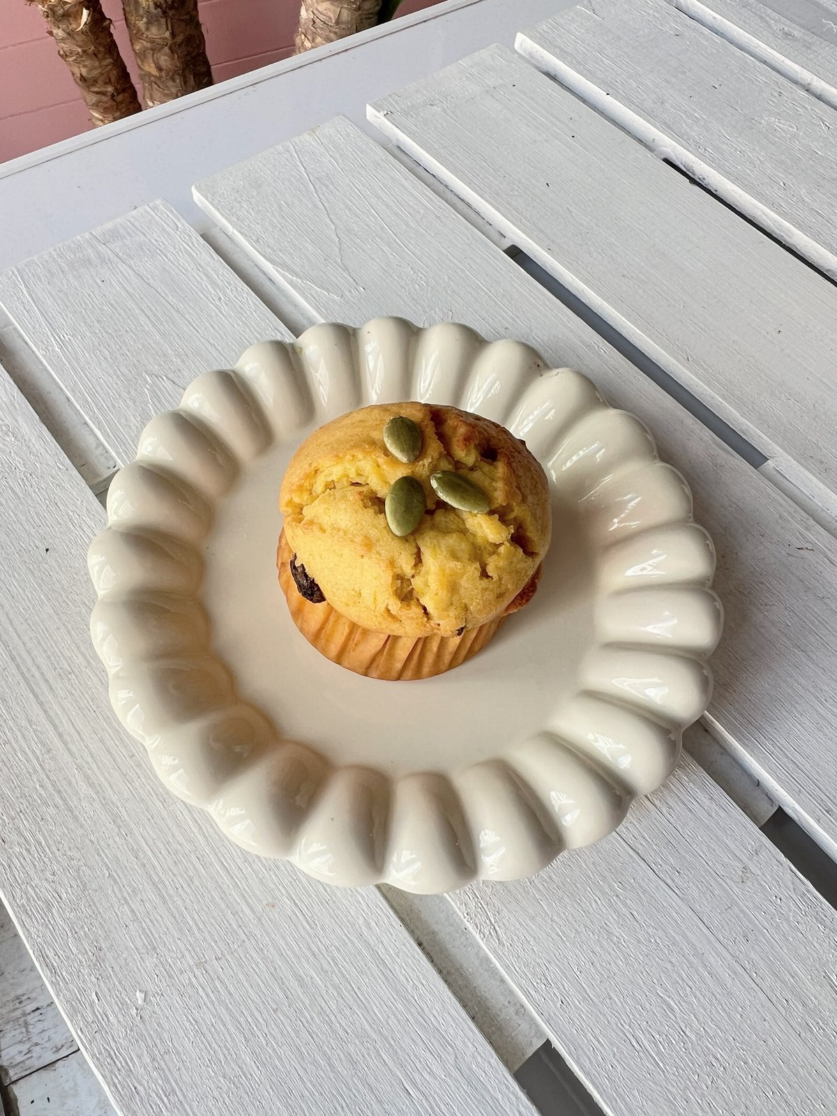 旬の栗かぼちゃ使用した季節のマフィン。ラムレーズンがアクセントです。