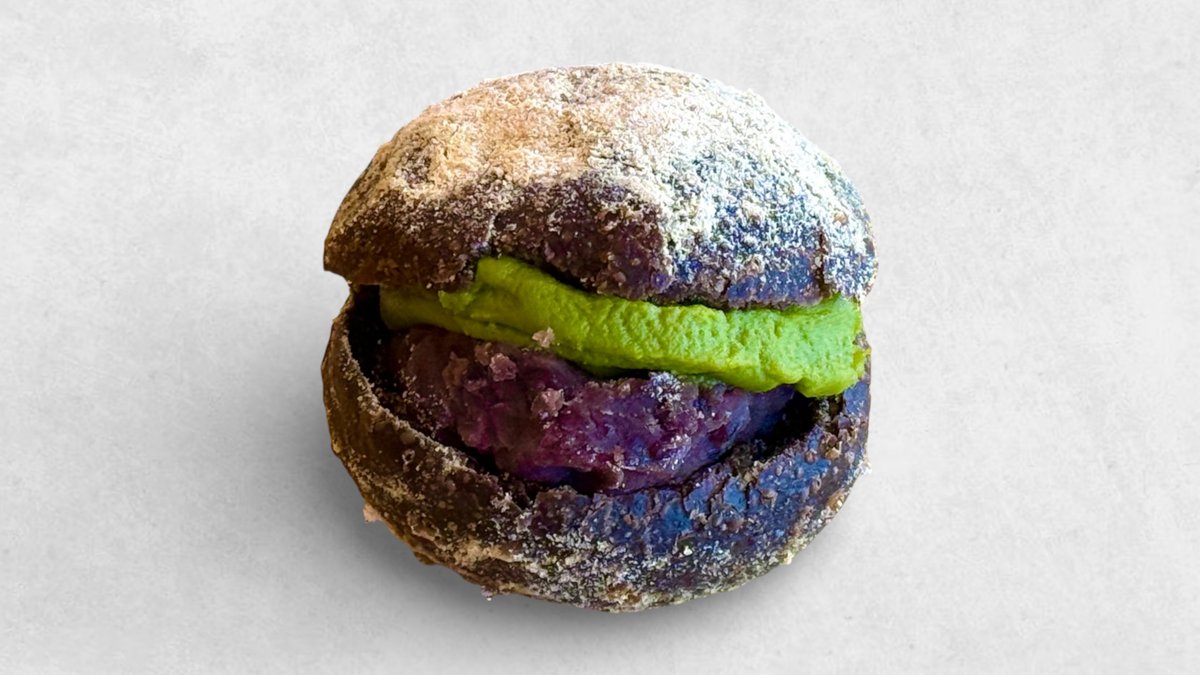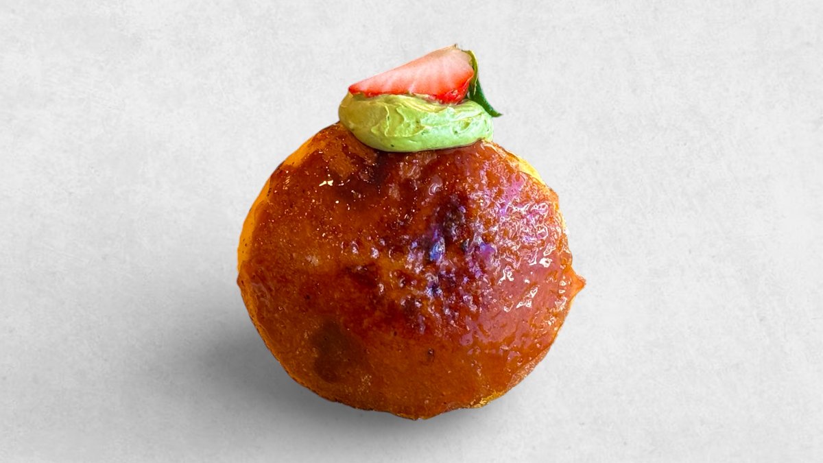 濃厚な宇治抹茶クリームをたっぷり詰めて、 表面をブリュレしたドーナツ。 トッピングは生いちご。