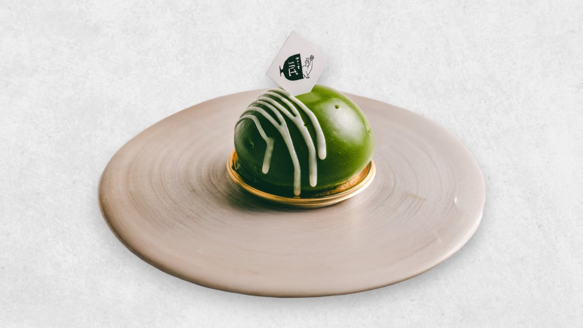 苔を模したスペシャリテ。 マスカルポーネムースに「かのこ大納言」とエスプレッソを染み込ませた抹茶スポンジでティラミス風に仕上げました。