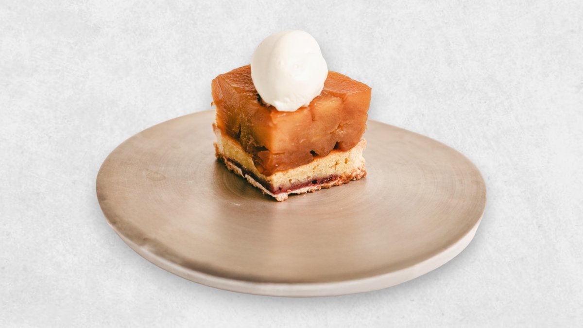 ユズピューレで炊いたカスタードクリームにメレンゲを合わせたシブストの中に、バナナのコンポート・アプリコットのタルトを合わせました。