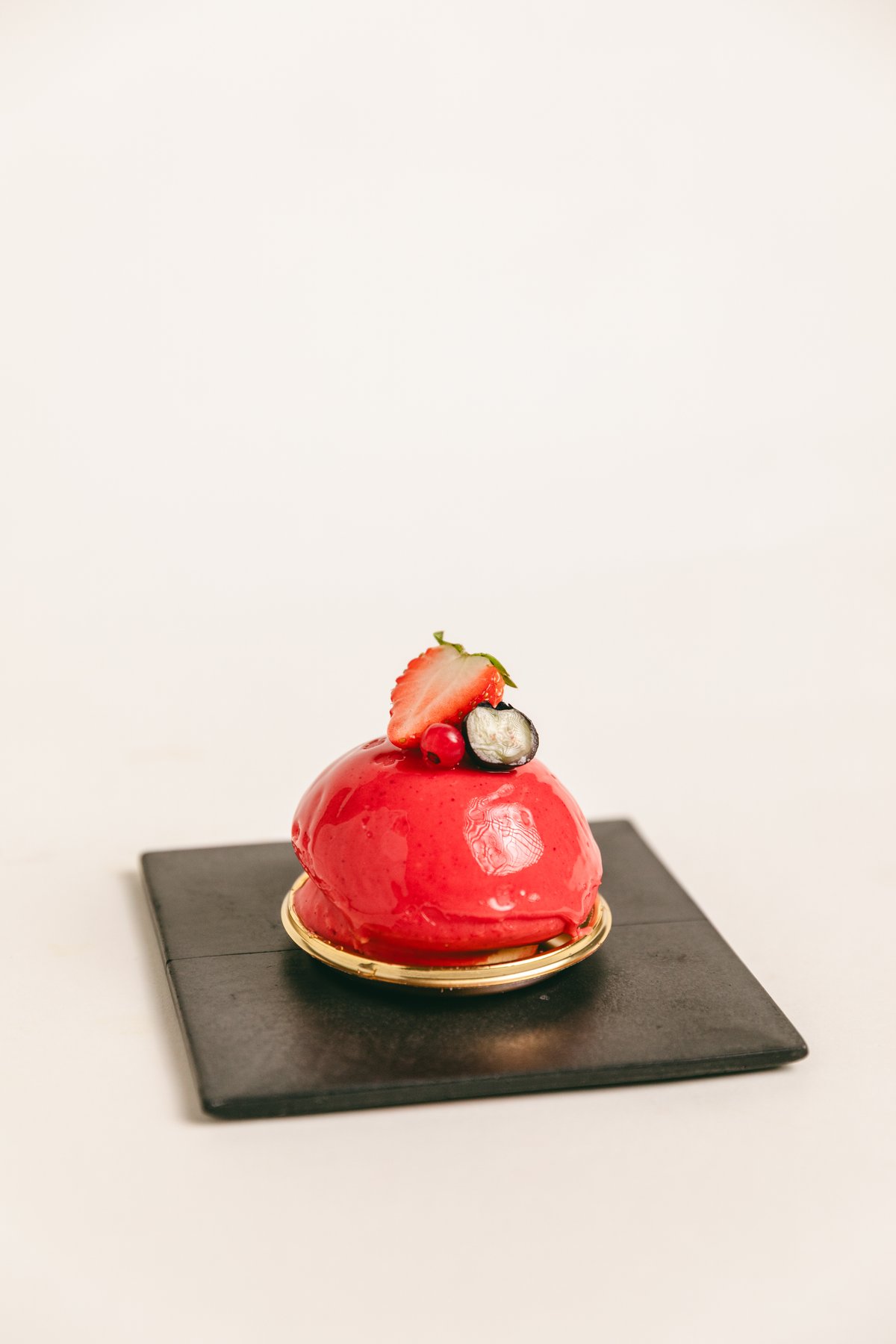バレンタインシーズン限定! ぱっと赤いフォルムが目を引くこのケーキは、イチゴ&ラズベリームースに中にクレームブリュレを閉じ込めました。756