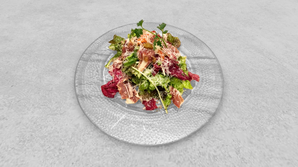 生ハムを原木からスライスしておりますので柔らかい塩味と脂の旨味がバランスよく味わえ、後を引きます 自家製のドレッシングにイタリア産ペコリーノチーズもかかった美味しい1品!!