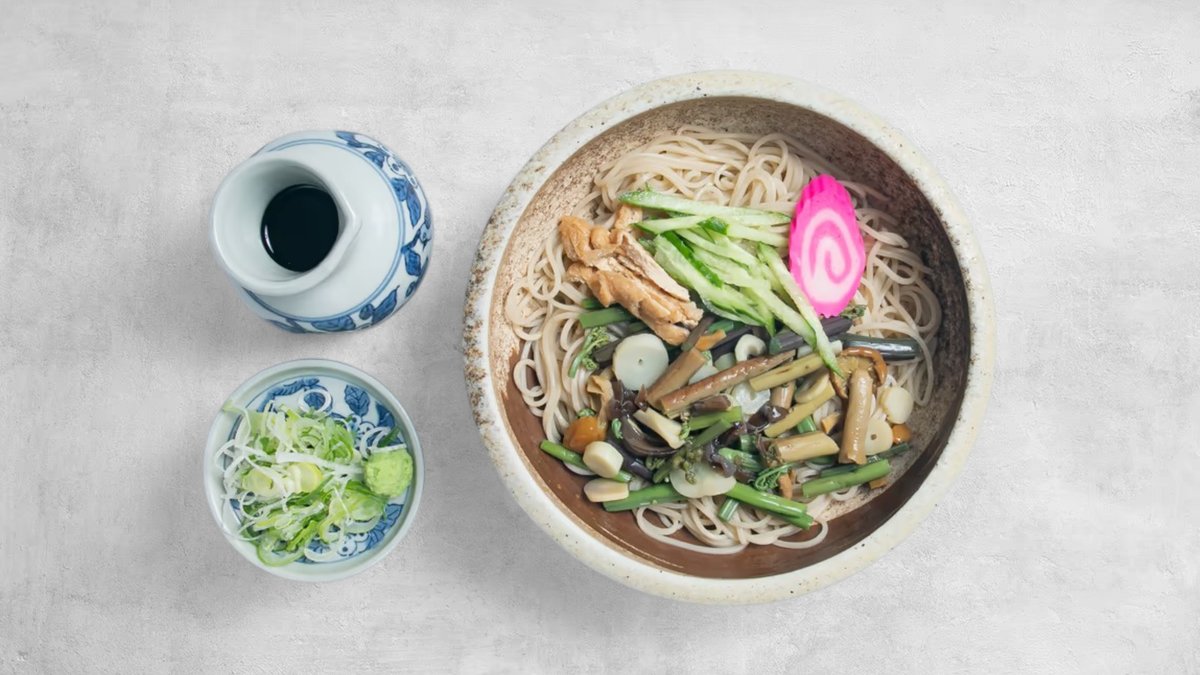 山菜の香り豊かな風味がそばと溶け合い、自然の恵みを感じる味わい。冷たい麺との相性も抜群です。