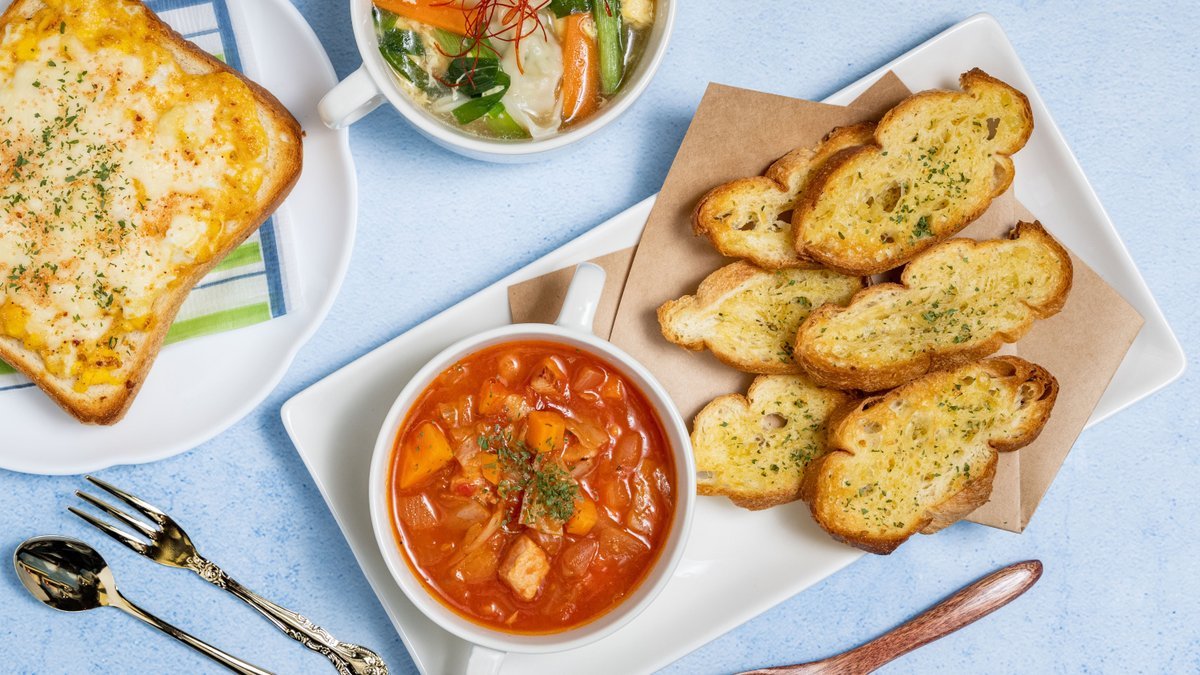 食べるスープandガーリックフランス・厚切りトースト・ホットサンド・あげぱん、がっつり食べたい方に丼ぶりメニューをご用意しているカフェバーです。オリジナリティ溢れるメニューをぜひご賞味ください🥣
