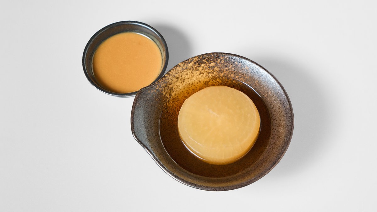 かつお・昆布・干し椎茸でじっくり引いた出汁がしみた三種盛り。やさしい旨さと香りを生姜味噌と一緒にお楽しみください。