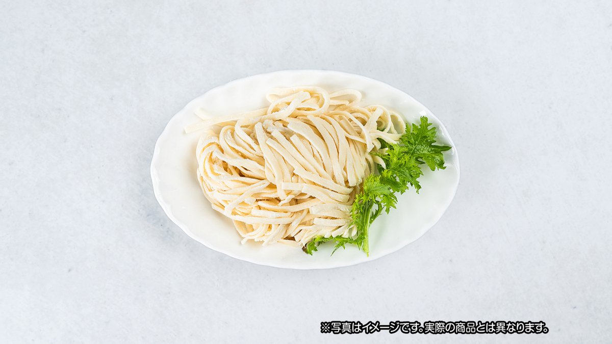 つるっとした喉ごしの細麺。豚汁の旨みとよく絡む、相性抜群のうどんです。