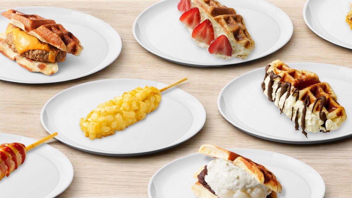 食べスタグリルのメニューは、クロッフルやチーズコーンドッグを中心としています。🧇チョコバナナクリームやストロベリークリームなどの甘いクロッフルのほか、ハムチーズやテリヤキハンバーグクロッフル、りんごあめなどが楽しめます。