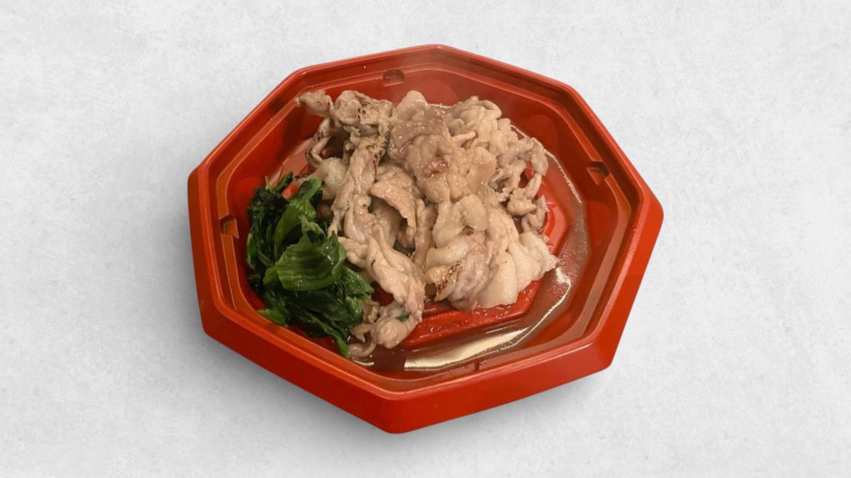 醤油風味の豚コマ焼き。臭みが少なく、タンパクな味わいです。付け合わせは在庫状況でランダムでお届けします。