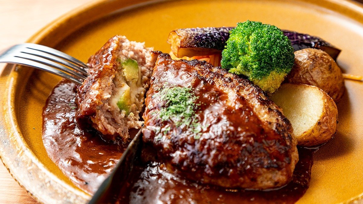 【大人気!】 どこかにアボガドチーズが!?食べてみればわかります。手作りハンバーグは国産牛と北海道「夢の大地豚」の合挽肉を使用。