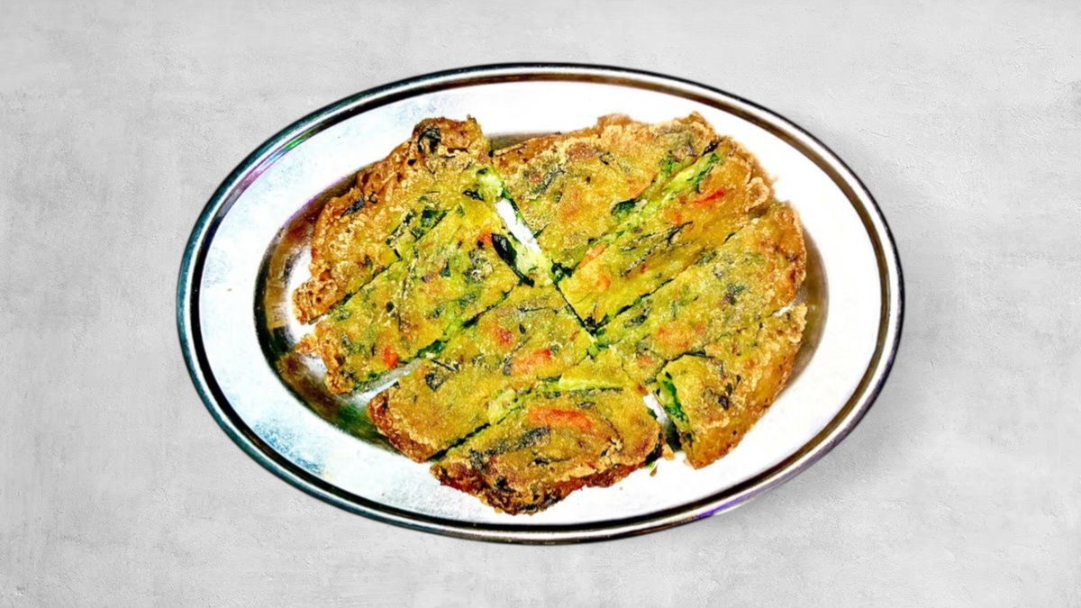様々な野菜を刻んで、小麦粉や米粉の生地と混ぜて焼き上げた、香ばしい韓国風お好み焼きです。外はカリッと、中はもちっとした食感です。