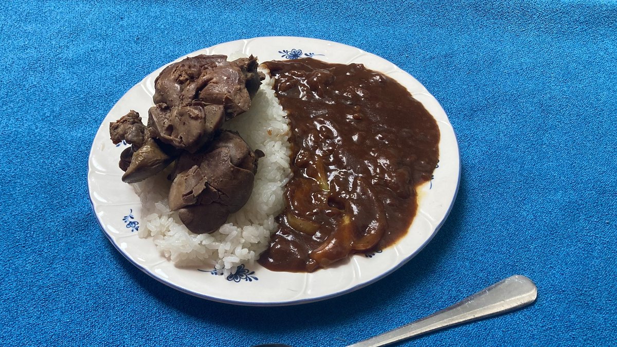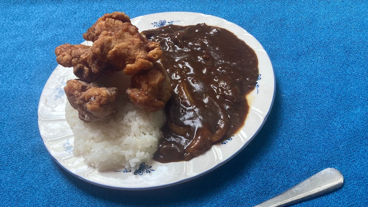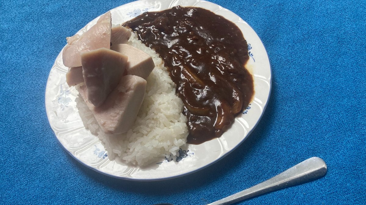 ガチの厚切り豚肉とカレーライスです。 福神漬けがキャベツに代替えになる場合がございます。