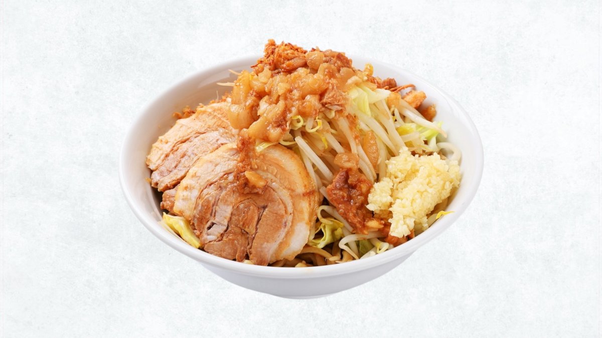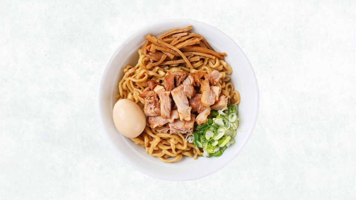 濃厚なタレに絡むワシワシ太麺の上に、ボリューム満点の豚肉を乗せた汁なし豚ラーメンです。パンチのある味わいで、しっかり食べたい方におすすめの一杯です。当店人気メニュー!(麺300g、豚二枚)