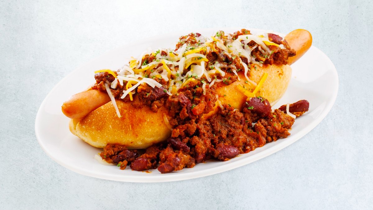 スパイシーなチリコンカンをたっぷりとかけた、食欲をそそる刺激的なホットドッグです。