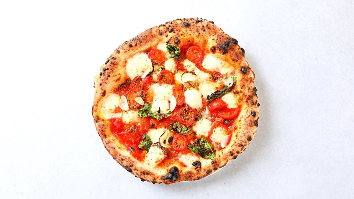 マルゲリータにアンチョビ、スライスガーリック、プチトマトがトッピングされています。香りもよくビールや炭酸との相性も良いです。パンチの効いた味となっております。
